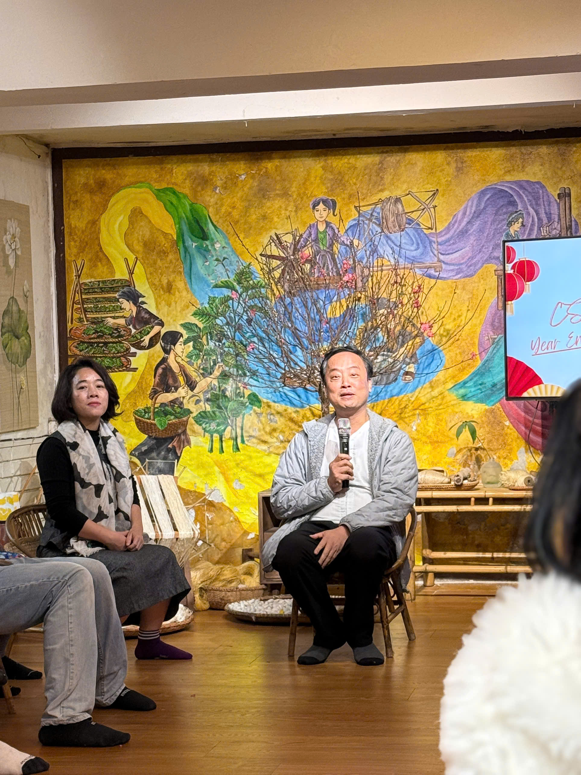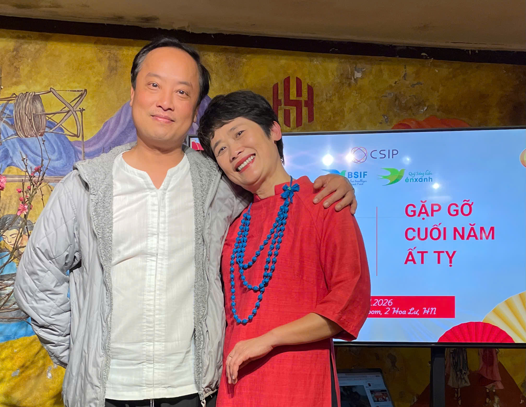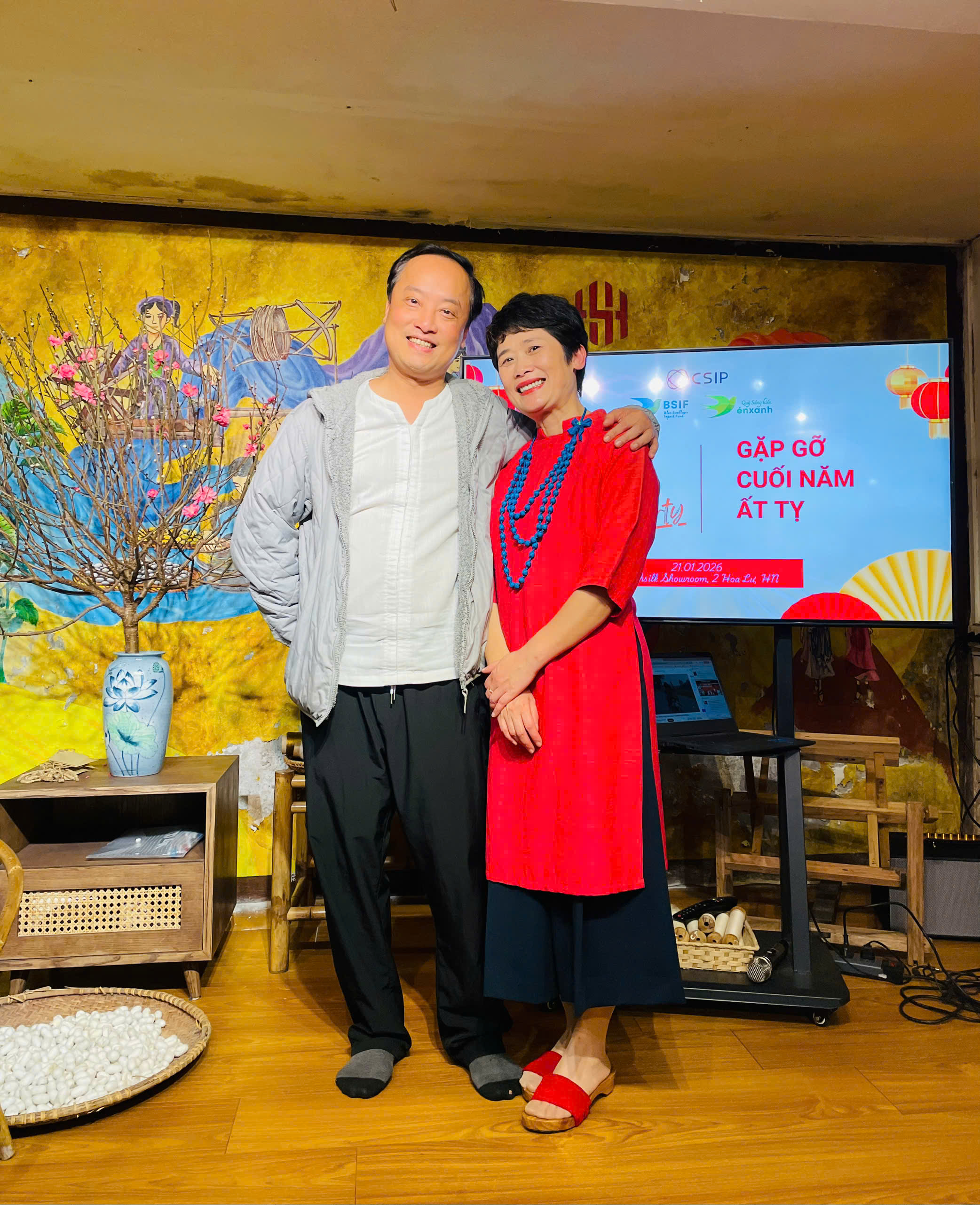 Năm nay, buổi gặp gỡ cuối năm của Csip tổ chức tại Hạnh Silk, giữa không gian của lụa đũi Nam Cao, chị Oanh chọn chiếc áo lụa đũi màu đỏ. Màu của lửa, của nhiệt huyết.